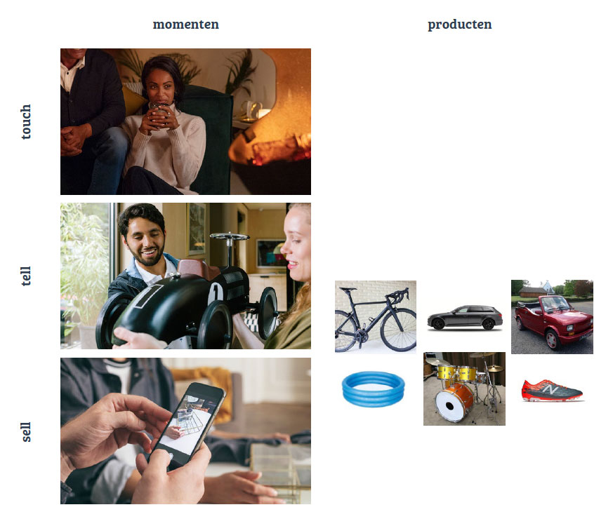 Op dit niveau willen we mensen activeren om Marktplaats te gebruiken. In fotografie zoomen we in op de activiteit of de handeling die centraal staat in een uiting. Ook zien we hier productfotografie. Om producten iets authentieks, persoonlijks mee te geven, laten we deze bij voorkeur in