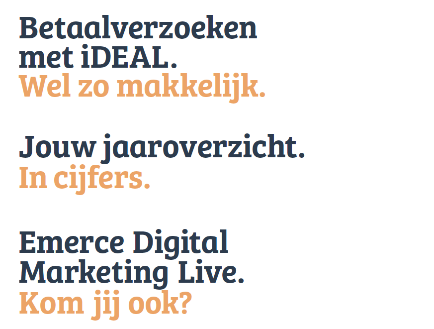 Headings bestaan altijd uit twee korte zinnen. We delen de boodschap op in tweeën: een krachtige hoofdboodschap en een korte toevoeging. Dat maakt dat de boodschap sneller aankomt en krachtiger zegt wat we bedoelen. Wat we precies zeggen en hoe we dat zeggen, wordt (ook) bepaald door het doel van de uiting.